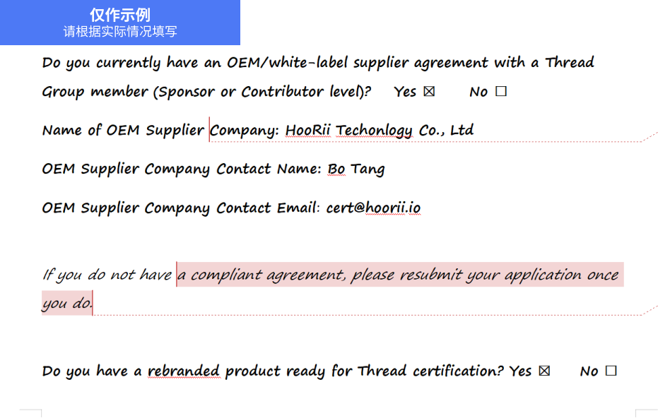 在会员登记表中,您可以选择会员级别与付款方式并勾选“发送发票”。审核通过后,thread group 将会把发票发送到您的邮箱。您只需按照发票上的支付信息支付费用即可。如果您是 Associate,入会费将会被免除,因此您可以跳过获取发票的步骤。 Associate 级别会员需要签署由 Thread Group 提供的以下协议,填写信息包括 HooRii 公司的信息和联系人。