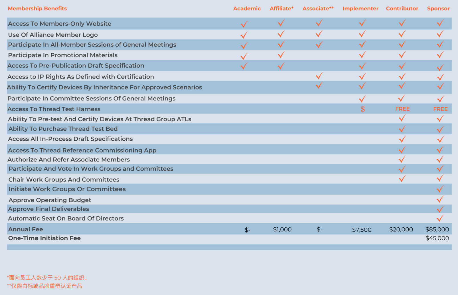 完成 Thread 的认证首先要注册 Thread Group 的会员。 目前有6个等级的会员,对应不同会员权益,更多的详细请在 Thread 官网可查看。