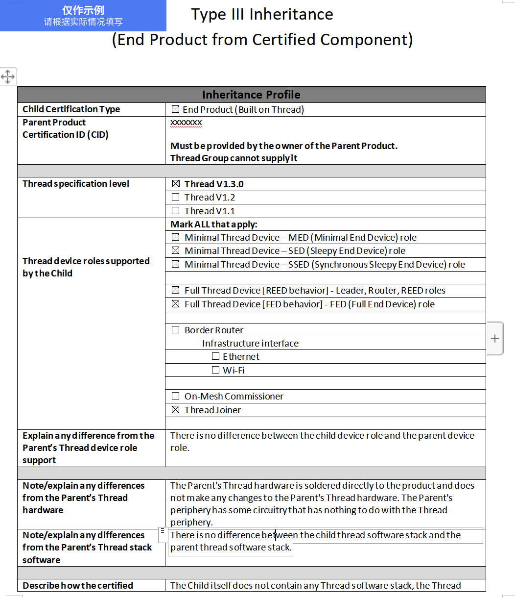 - 请填写 Thread 产品继承认证申请表。(有关技术信息和软件版本信息、CID等,请咨询认证辅导支持人员)