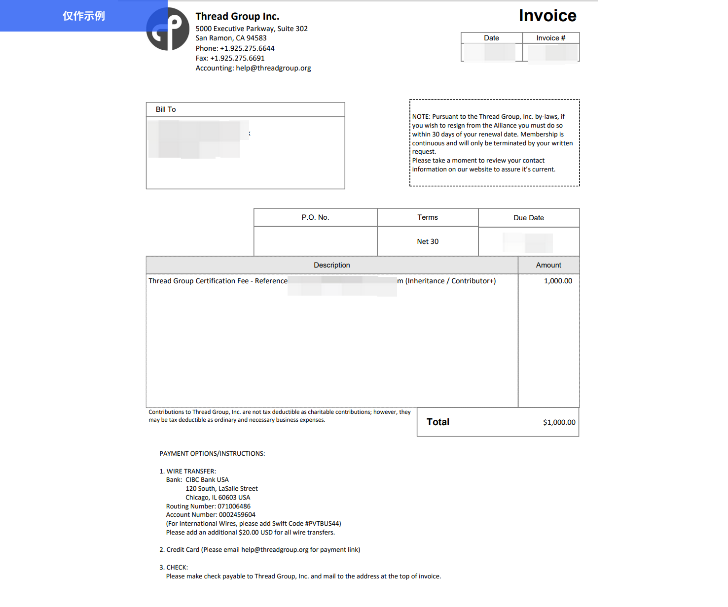 获得 Thread 证书后,预留的财务邮箱将在一到两周内收到发票。请按照发票上的支付信息支付费用即可。