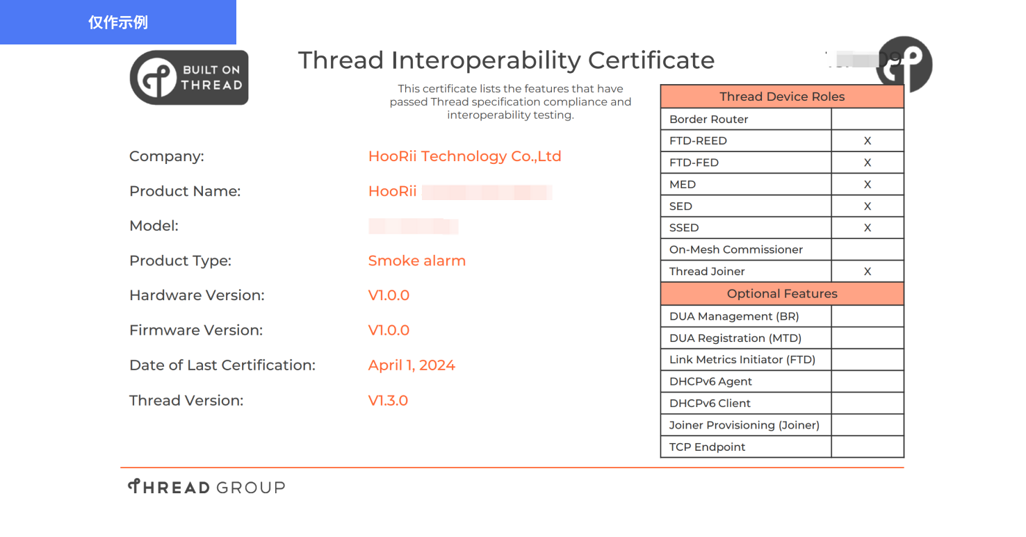 Thread Group将预先提供一份包含预分配CID的继承认证申请表的PDF文档,此时请注意,认证流程尚在进行中,数据审核环节尚未完成。只有当您收到正式的“Thread Interoperability Certificate”文件,即标志着Thread证书的获得,此时认证才被视为通过。